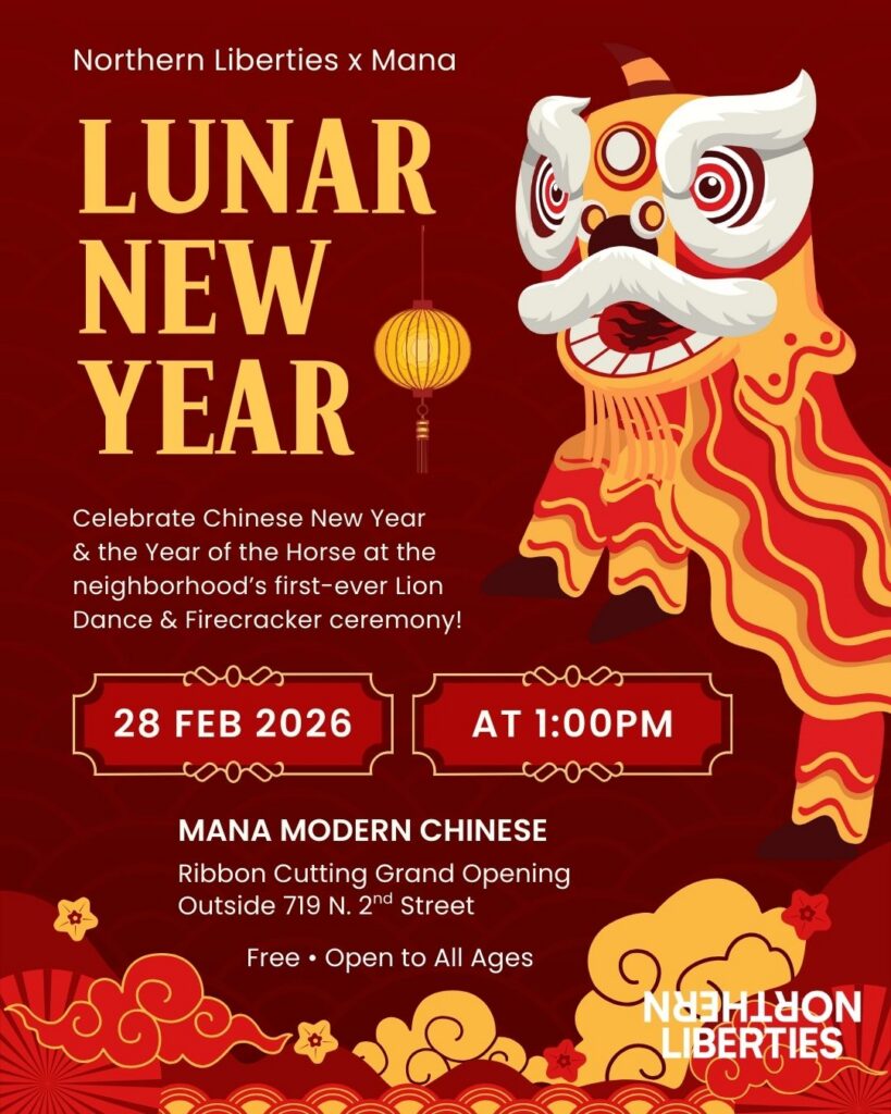 Celebrate Lunar New Year: Year of the Horse with Northern Liberties Business Improvement District and Mana Modern Chinese. Join us on Saturday, February 28, 2026, at 1:00pm, outside Mana at 719 N. 2nd Street, for a grand opening ribbon cutting ceremony, lion dance, firecrackers and more. Open to all ages, family friendly.